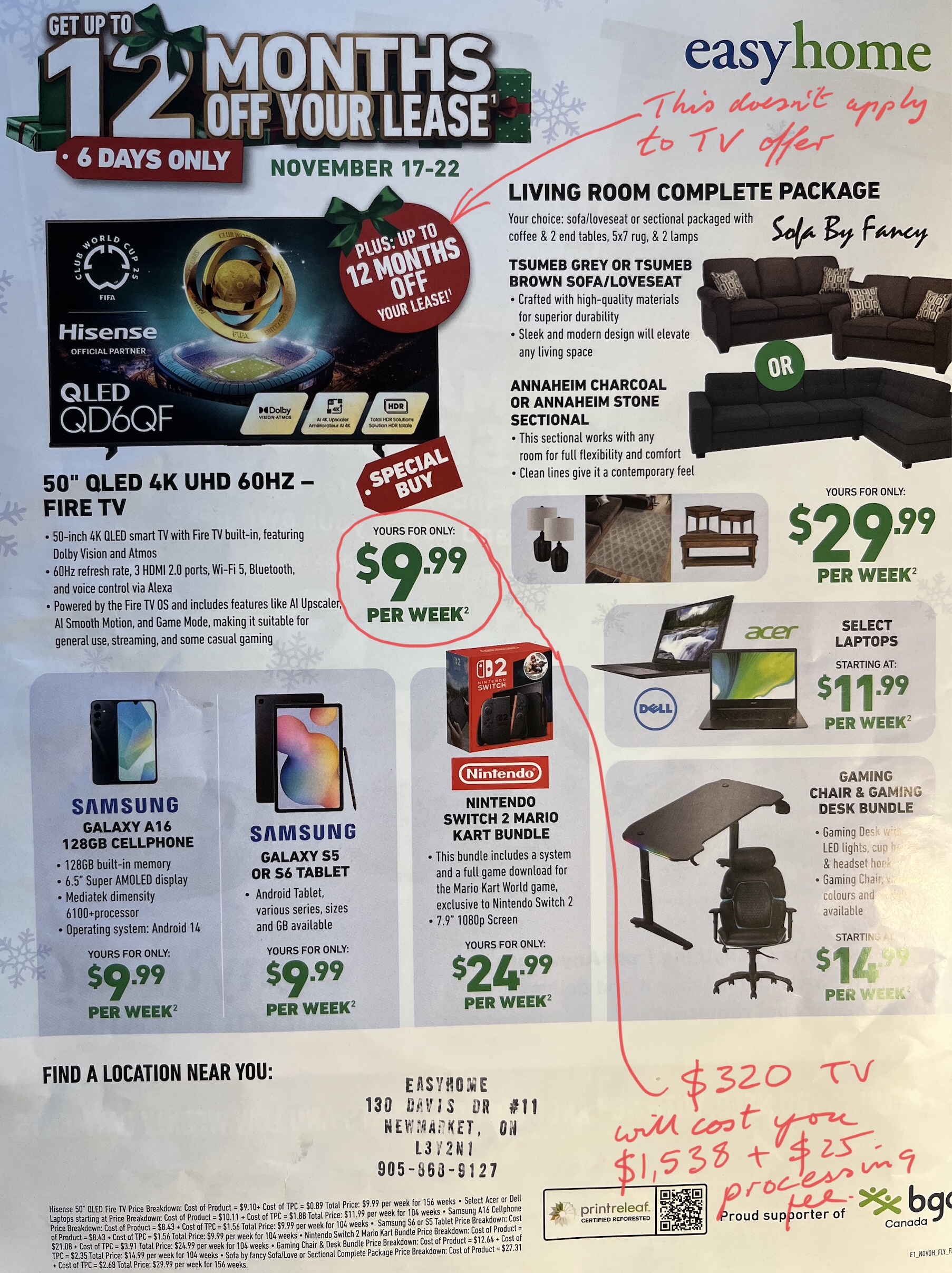But it’s not immediately obvious that doesn’t apply to the TV where the weekly payment is $9.99 and the "12 months off" offer only applies to weekly lease payments of $15.99 a week or more.
