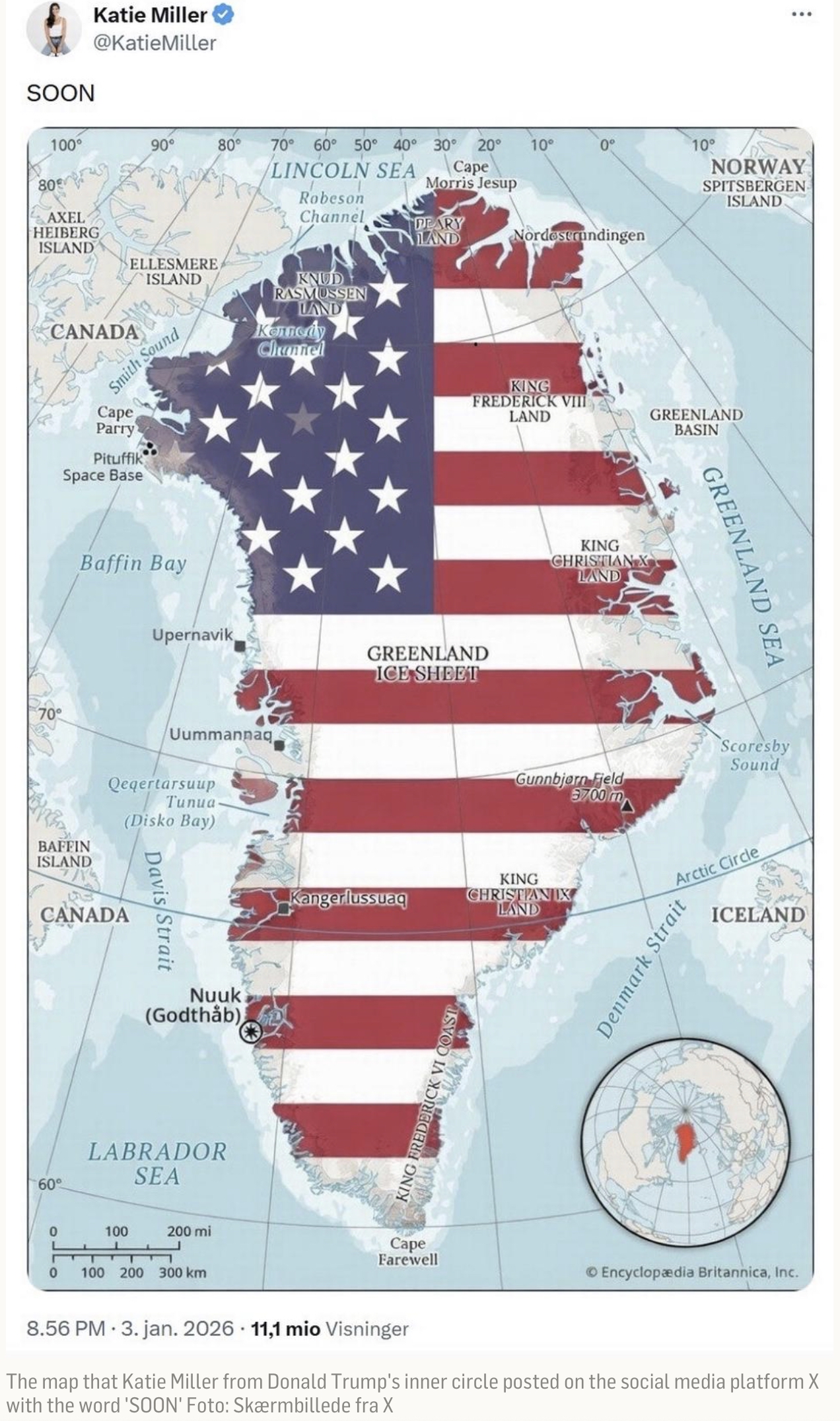The graphic posted on X on 3 January 2025 by Katie Miller, wife of the Don’s consigliere, Stephen Miller, makes it clear Trump wants Greenland sooner rather than later.